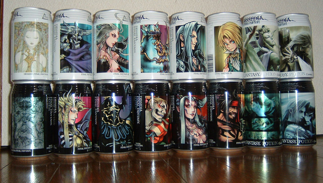 ポーションゲットしてきた、重かった…! 家に帰ってからチェックしたら7缶とCGスコール缶のそれぞれ1つづつ買いそびれた。フルコンプオワタ。しかし7はなかった気がするんだよなぁ。缶をカートに入れる時急いでたので(嬉しさに猛烈挙動不審)、アルティミシアと雲姉さんが区別つきにくかった。しかし14個までゲットできればいいかな、明日行っても欠落ナンバーが7だけにもうなさげな雰囲気が。多分一番人気は7だろうし。で、天野絵のカオス缶は誰が誰だか分からない、鎧多すぎだ(笑) カオスの股間にいるのがゴル様か。天野絵コスモス缶はこれ、中央のフリオがリーダーのようだよ。