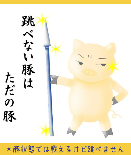 この状態でホーリーランスをシャリン~と鳴らしながら華麗に戦ってくれる某竜騎士が大好きだ。ラスダンでは一言メッセージで葛藤しながらも豚状態で疾走し、ドラゴンやフェイズとも果敢に戦う。可愛すぎてもう堪らん。